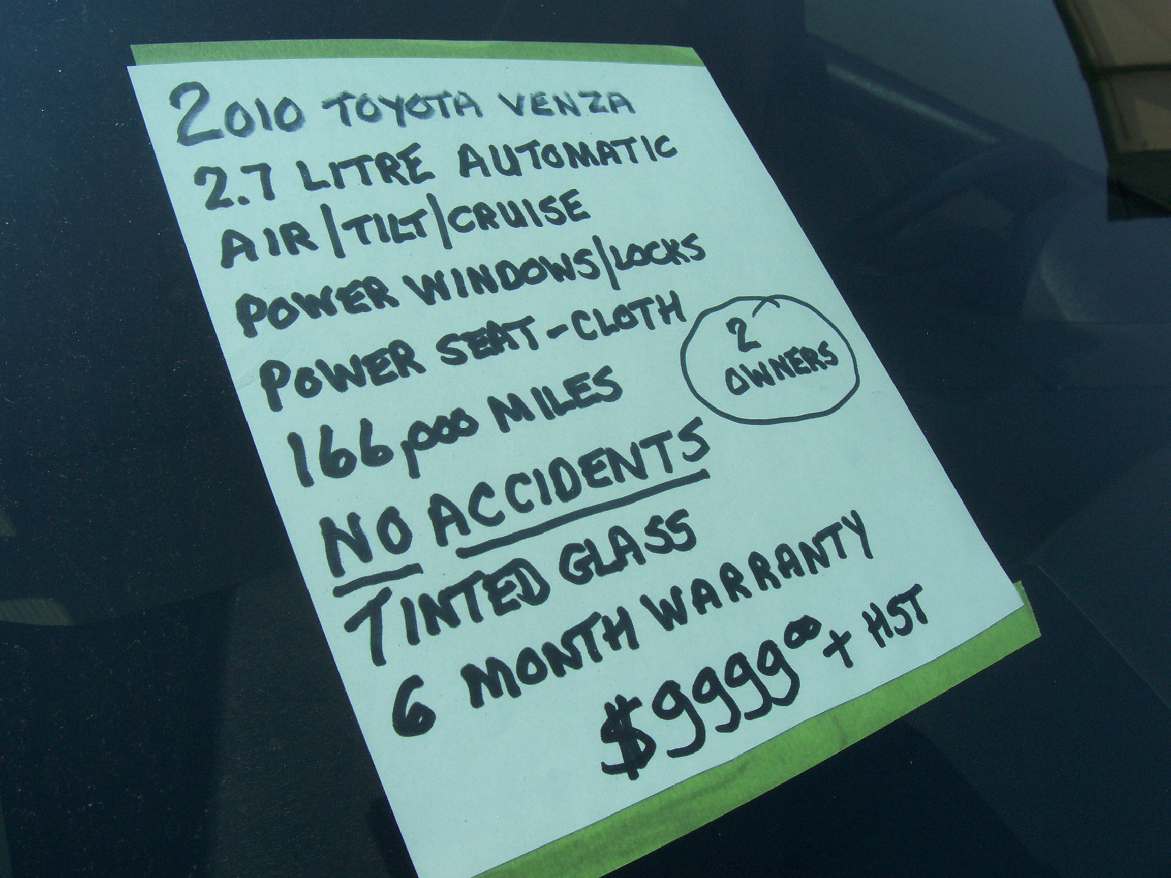2010 Toyota Venza FWD $9999.00 2.7 litre automatic, air, tilt-cruise, power windows & locks, power cloth seat, tint, 2 owners, no accidents, 166,000 miles, 6 month warranty included.