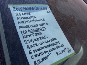 2015 Honda Odessey LX $11,500.00 3.5 litre automatic, air, tilt-cruise, power windows & locks, power cloth seat, no accidents, new tires, tint, 274,000kms. back-up camera, 6 month warranty included.